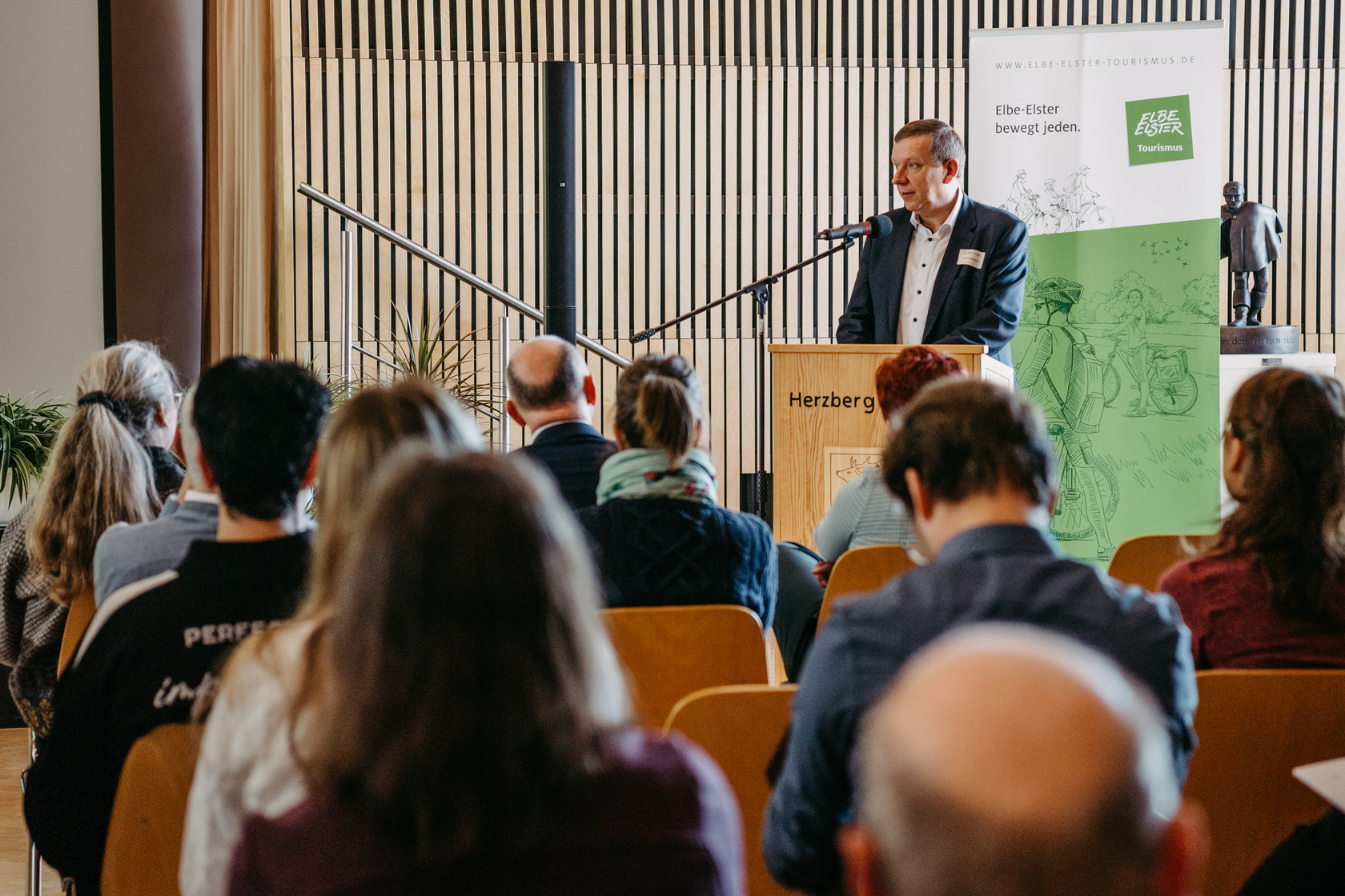 Nach dem musikalischen Auftakt durch Kult!INKoffer und Grußworten von Landrat Christian Jaschinski sowie der Stadt Herzberg informierte der Tourismusverband Elbe-Elster-Land e.V. über neue Vorhaben. Ein besonderes Highlight war die Vorstellung des Projekts „Qualitätscheck von Rad- und Wanderrouten“ sowie die Einbindung regionaler Akteur:innen in die neue Tourismuskonzeption Elbe-Elster.